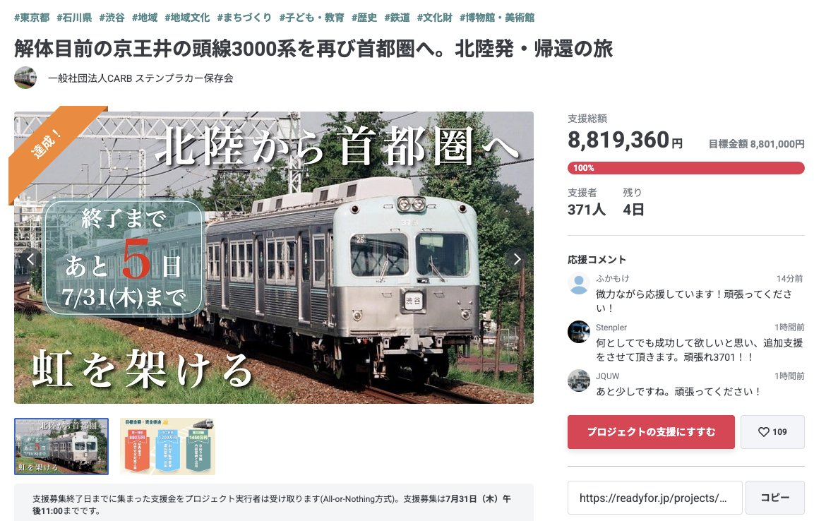 一般社団法人CARB ステンプラカー保存会で実施しました、クラウドファンディング「解体目前の京王井の頭線3000系を再び首都圏へ。北陸発・帰還の旅」について